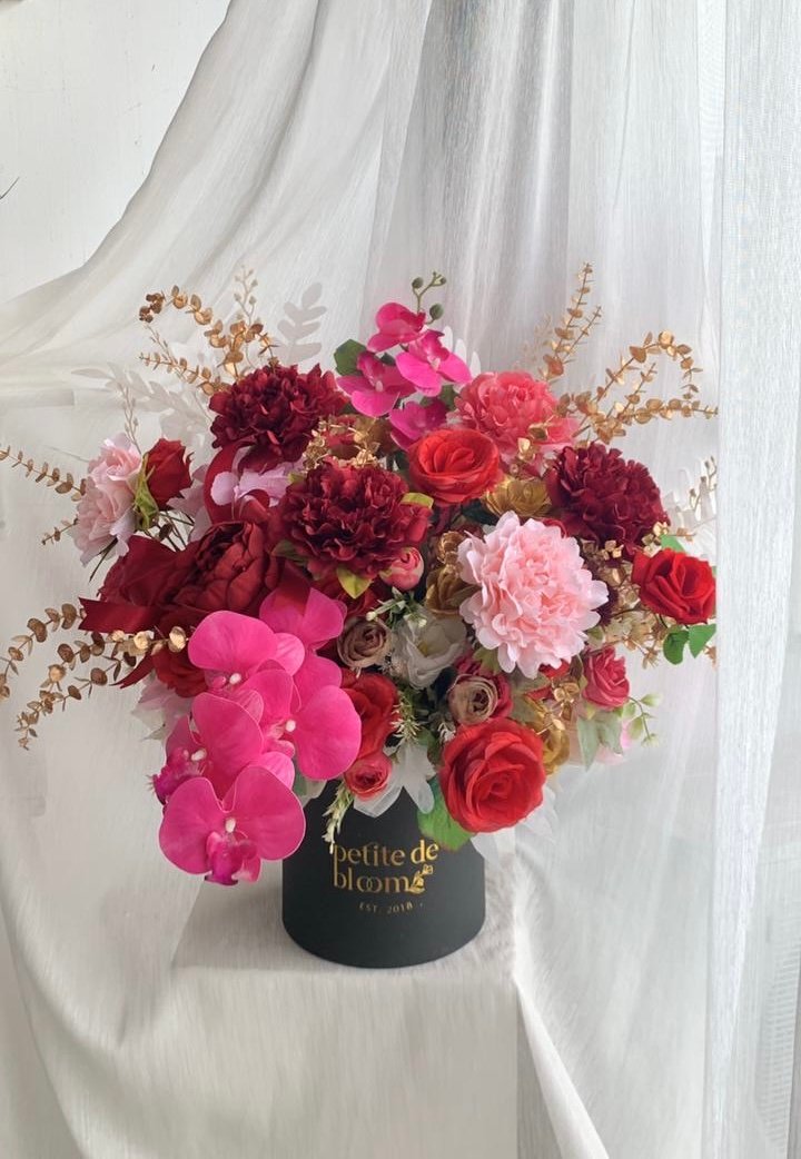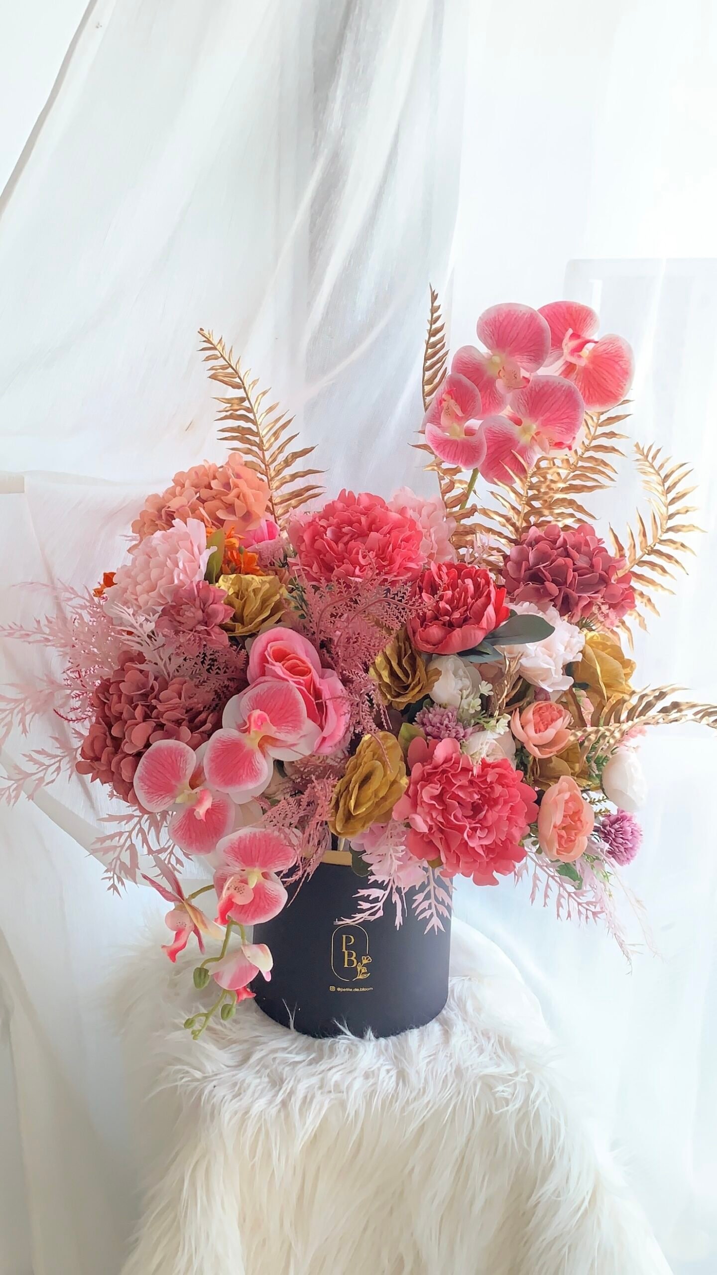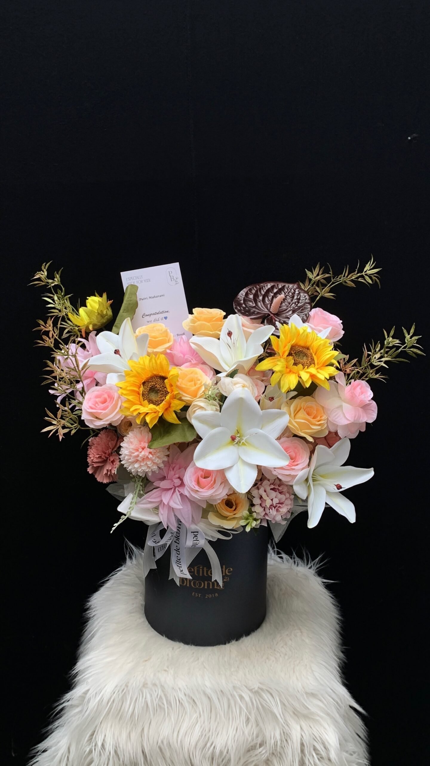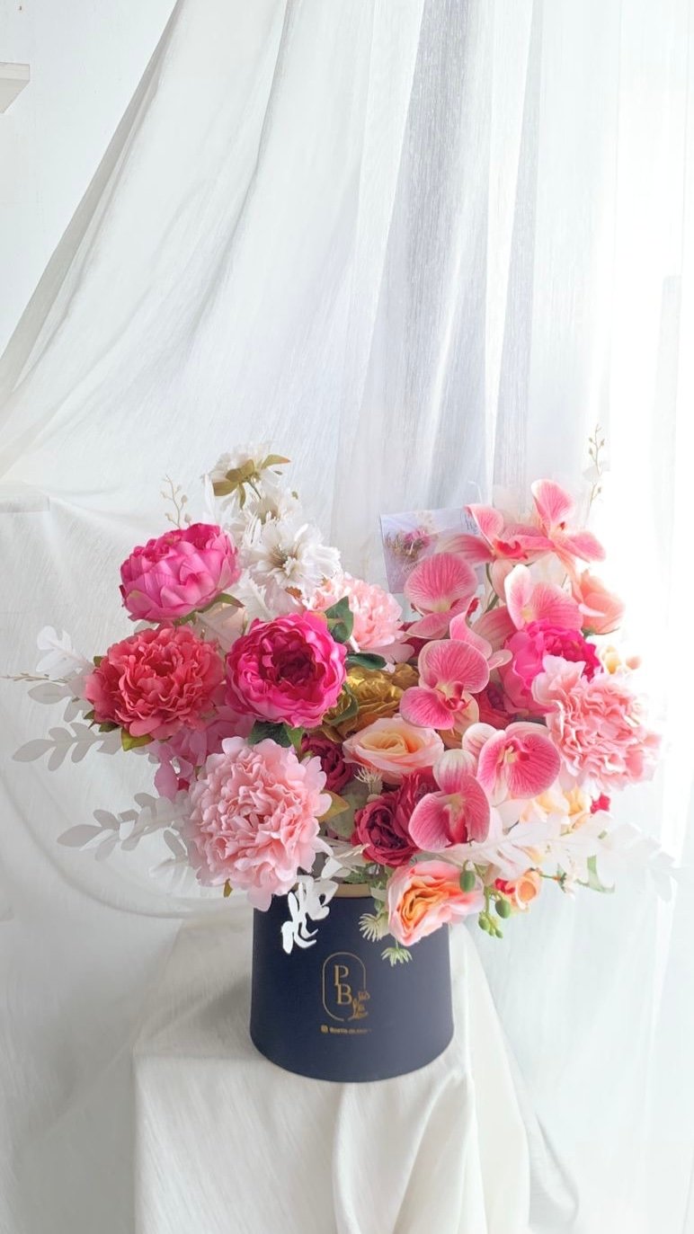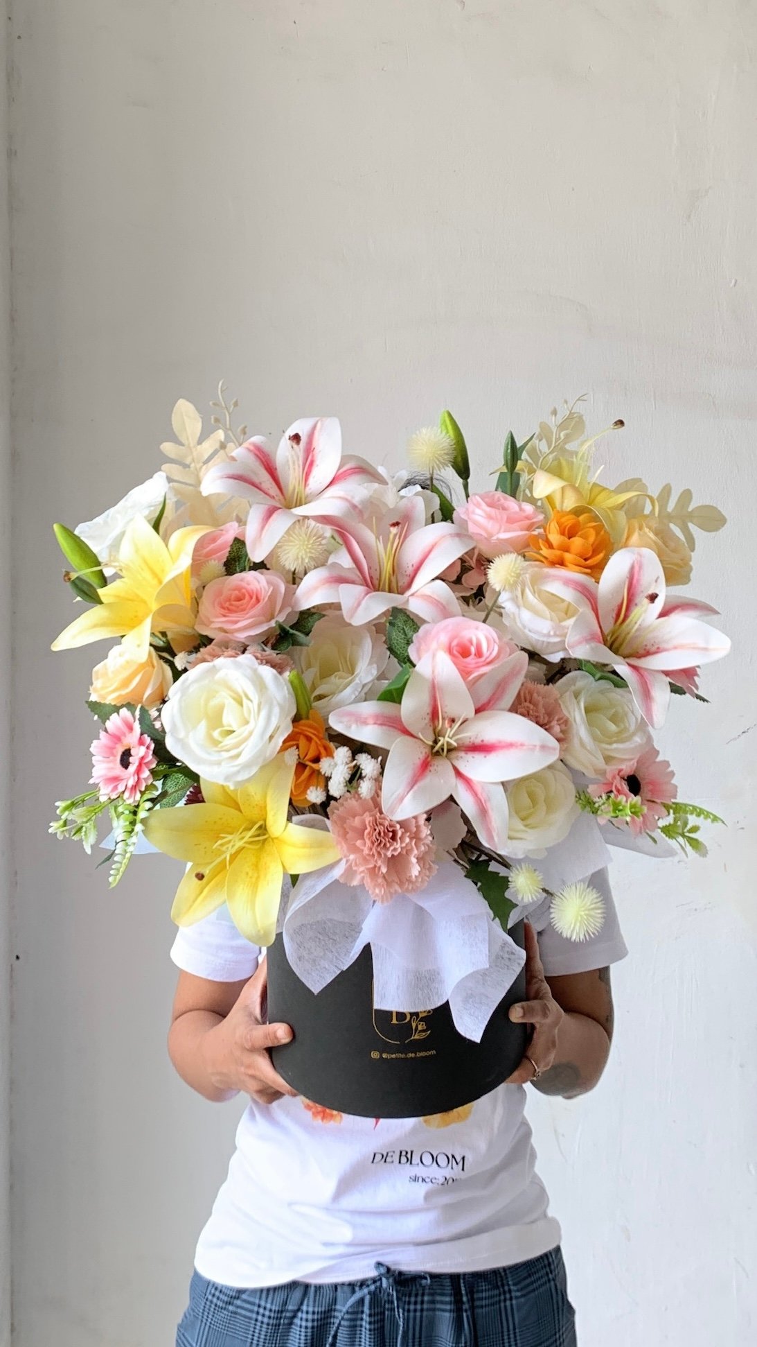 A perfect mix of fresh, vibrant blooms arranged in a 20cm bloom box — not too small, not too big, just beautifully balanced. Choose the flower size that suits your style: medium, medium-big, or big. You pick the vibe, and we’ll handle the rest with care and creativity! available in fresh flowers/ artificial flowers.( The photo is for reference only.)