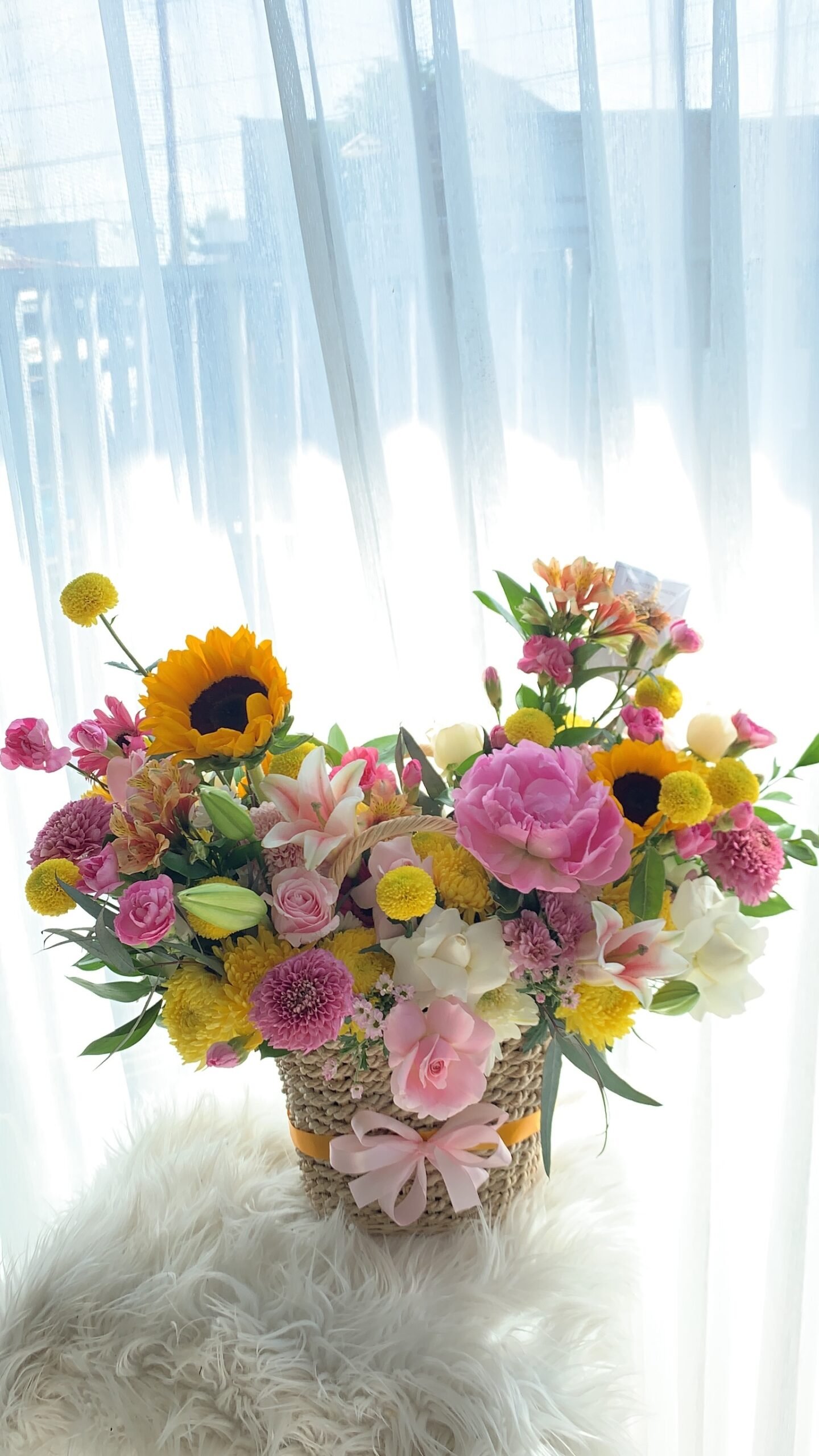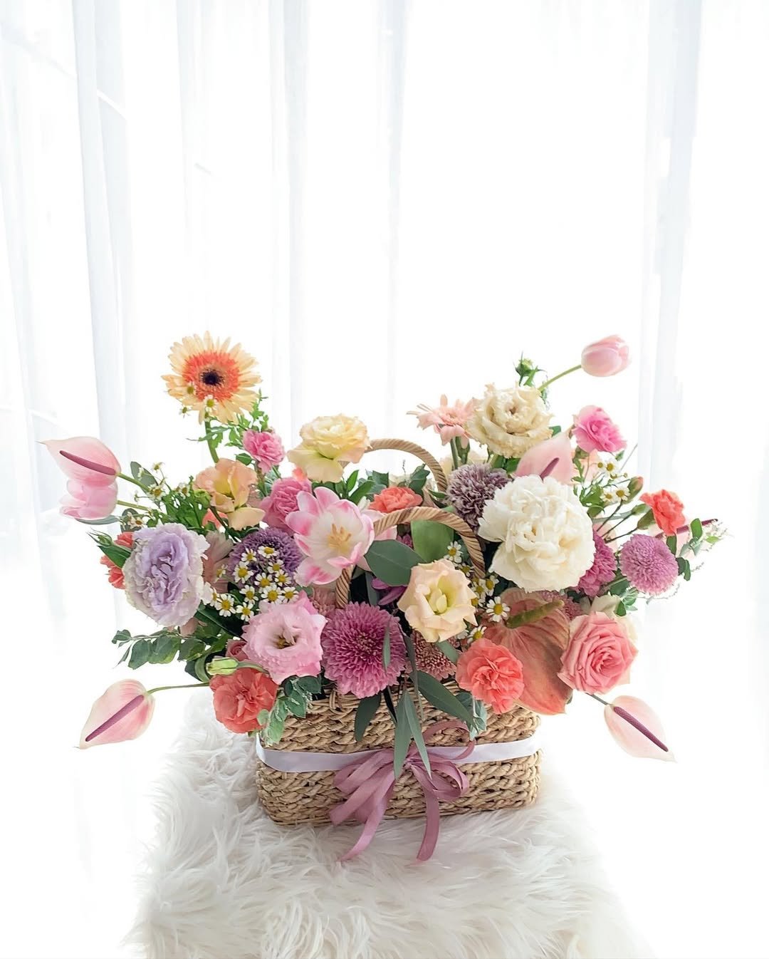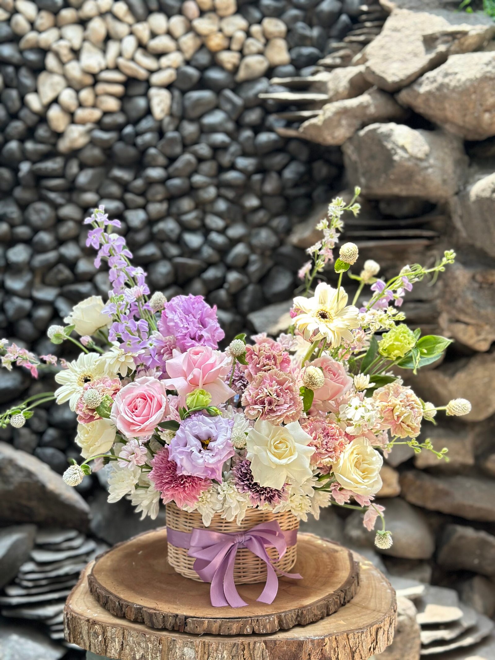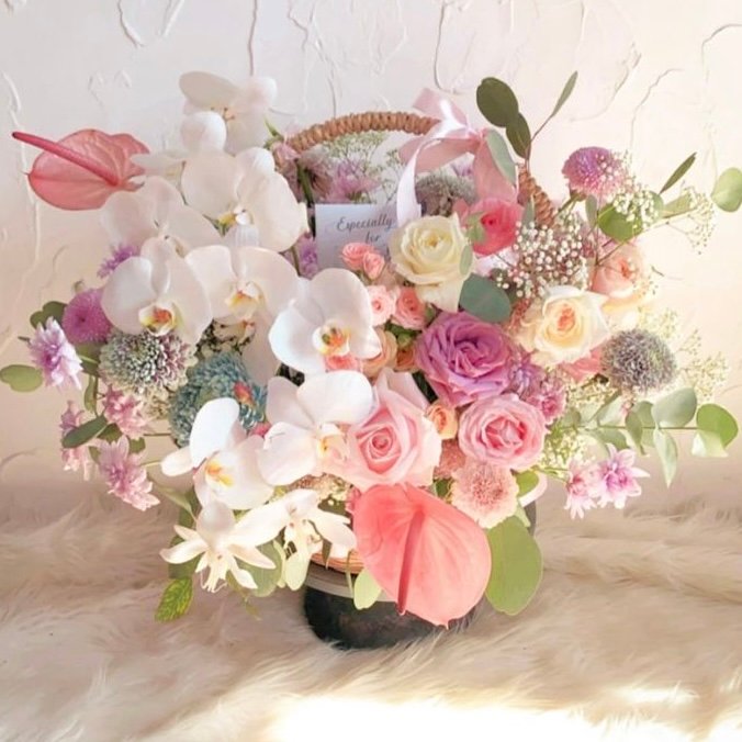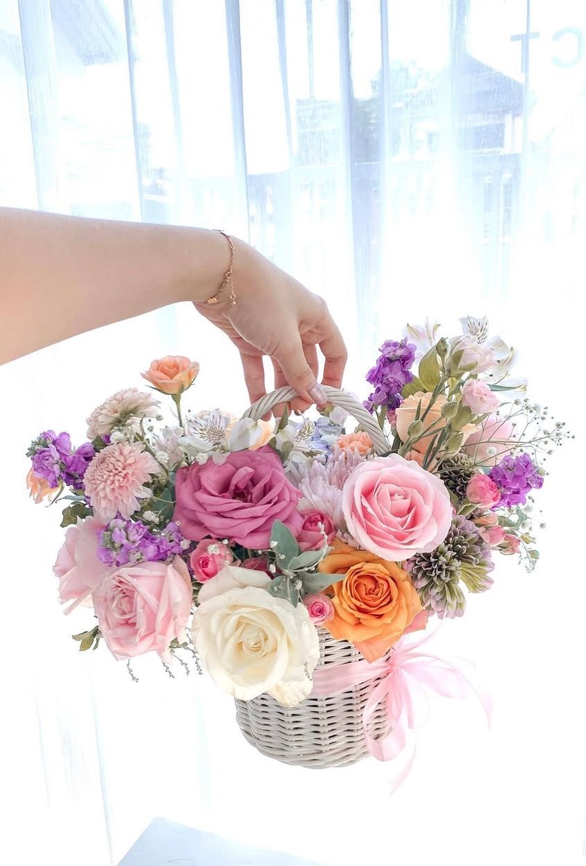 A charming mix of fresh flowers arranged in a classic basket — perfect for any celebration or thoughtful gesture.Choose your preferred color palette and flower size: medium, medium-big, or big. We’ll craft a beautiful, balanced arrangement just the way you like it — effortlessly elegant and full of heart.