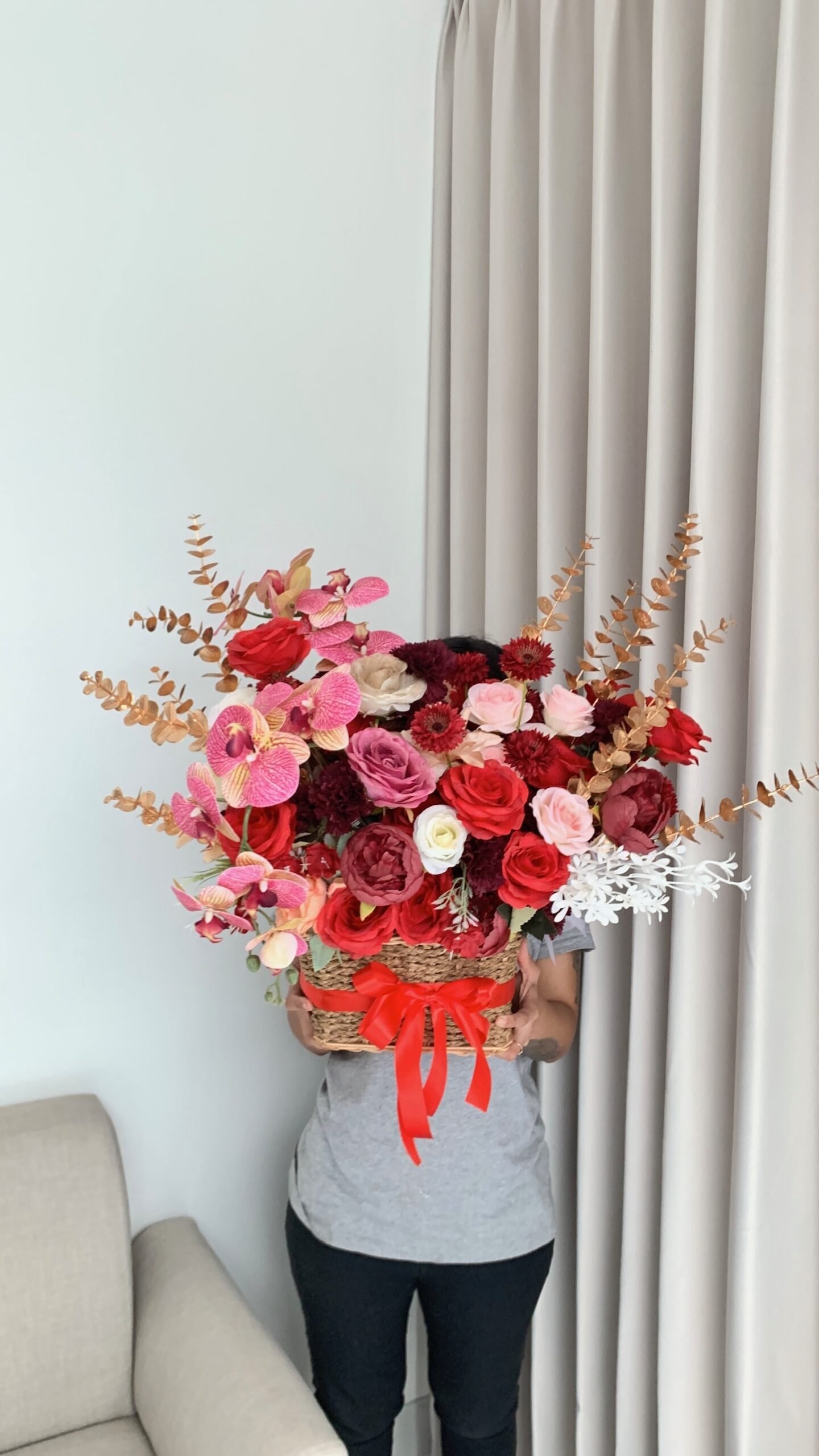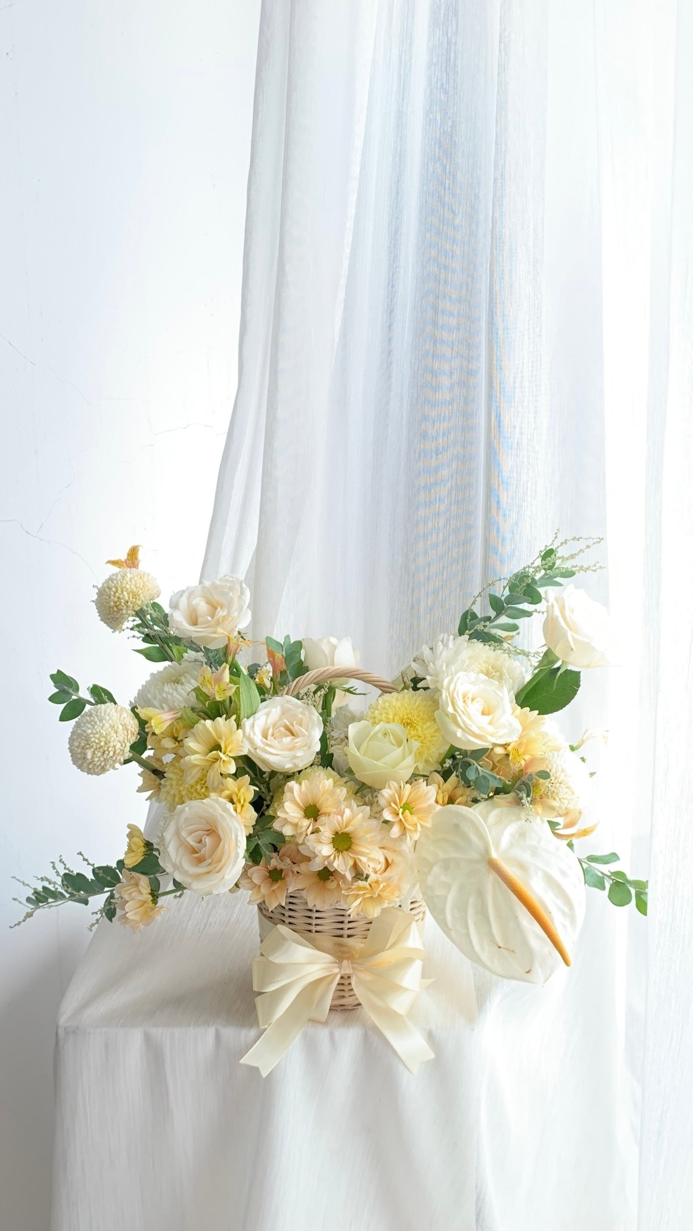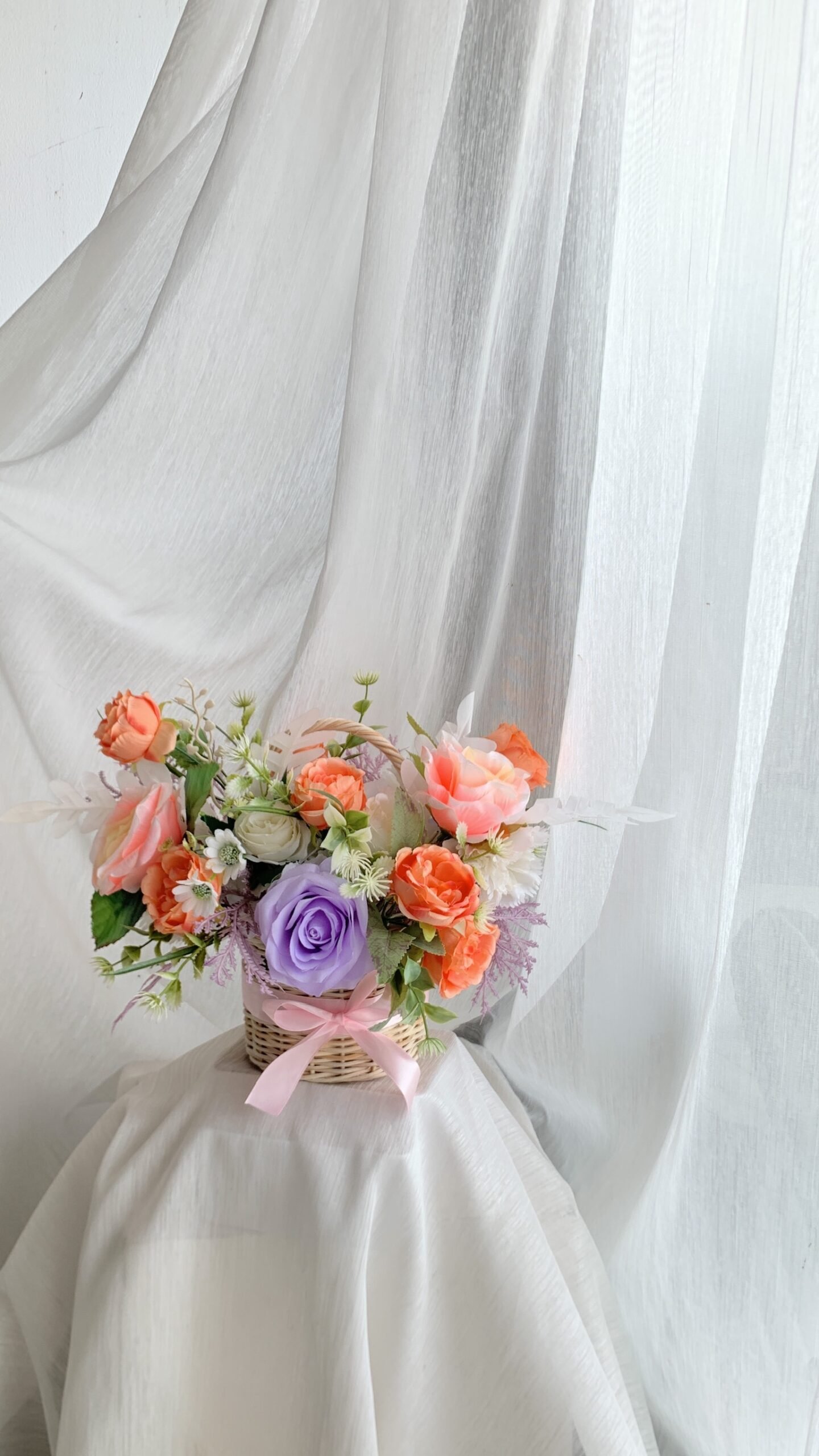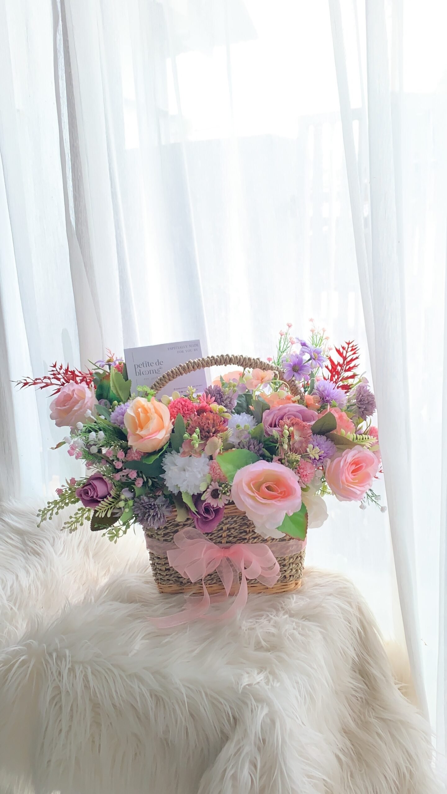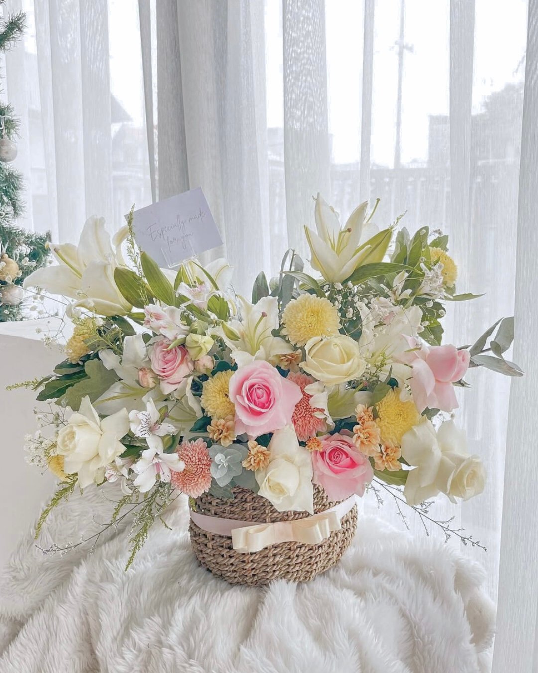 A charming mix of fresh flowers arranged in a classic basket — perfect for any celebration or thoughtful gesture.Choose your preferred color palette and flower size: medium, medium-big, or big. We’ll craft a beautiful, balanced arrangement just the way you like it — effortlessly elegant and full of heart.