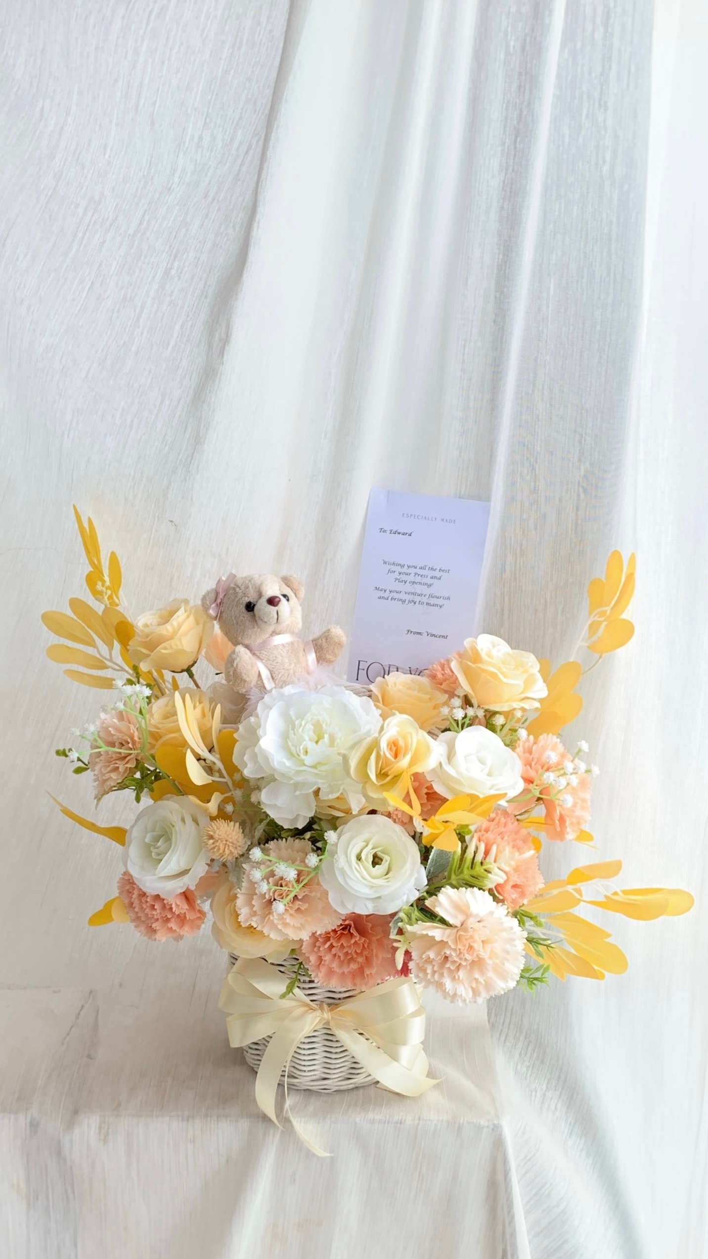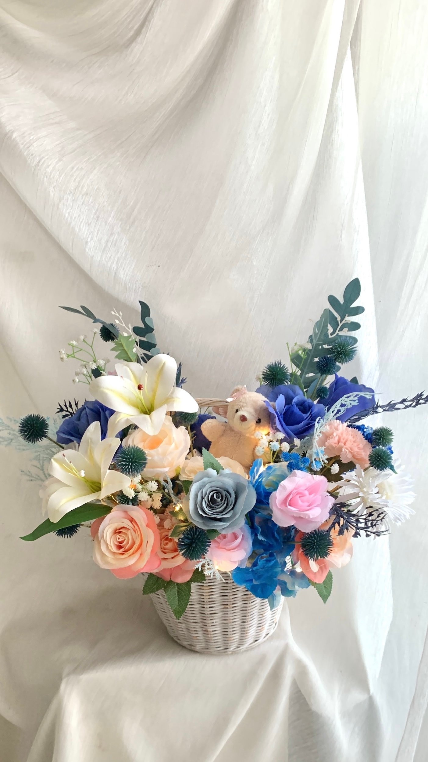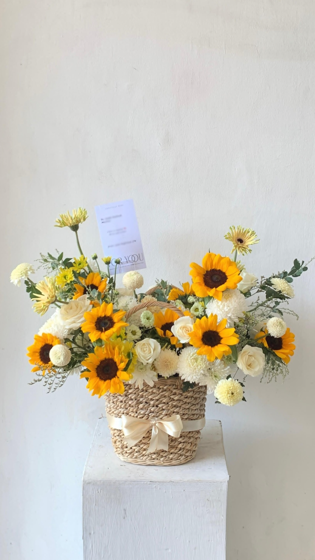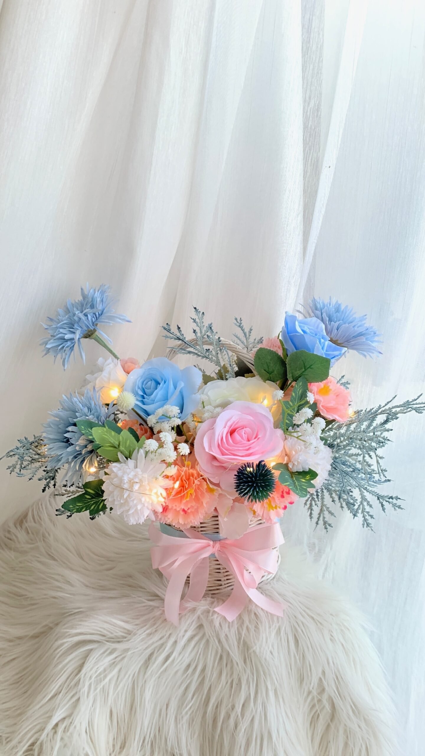 A charming mix of fresh flowers arranged in a classic basket — perfect for any celebration or thoughtful gesture.Choose your preferred color palette and flower size: medium, medium-big, or big. We’ll craft a beautiful, balanced arrangement just the way you like it — effortlessly elegant and full of heart.