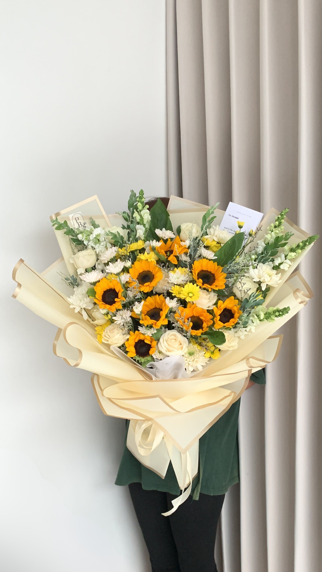 A little joy, wrapped in golden petals. Choose your preferred color mixed with the yellowish of sunflower and we’ll take care of the rest. available in fresh or artificial. Our florists will design your arrangement dearly. Any substitutions of the secondary flower will be of equal or higher value.