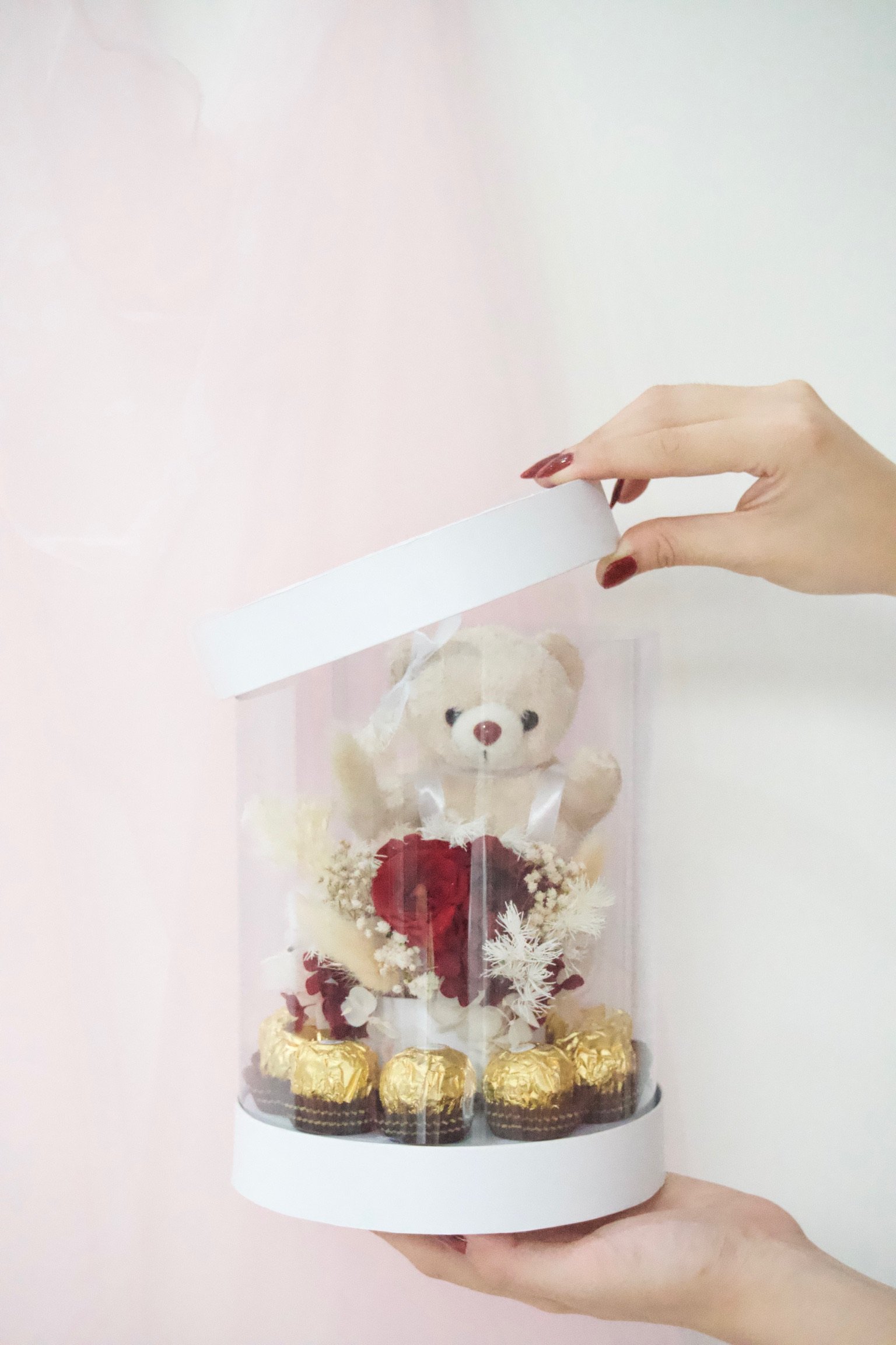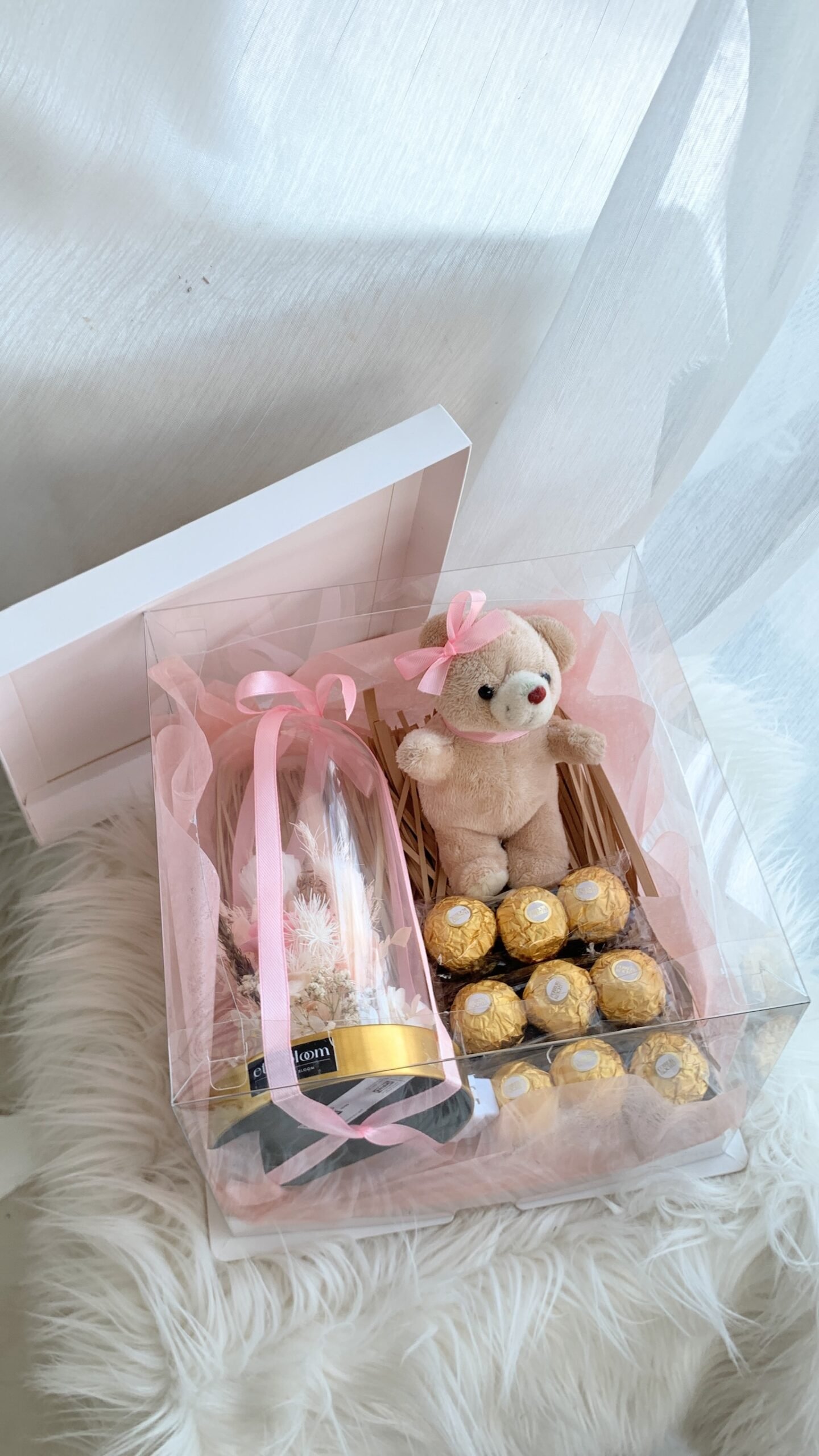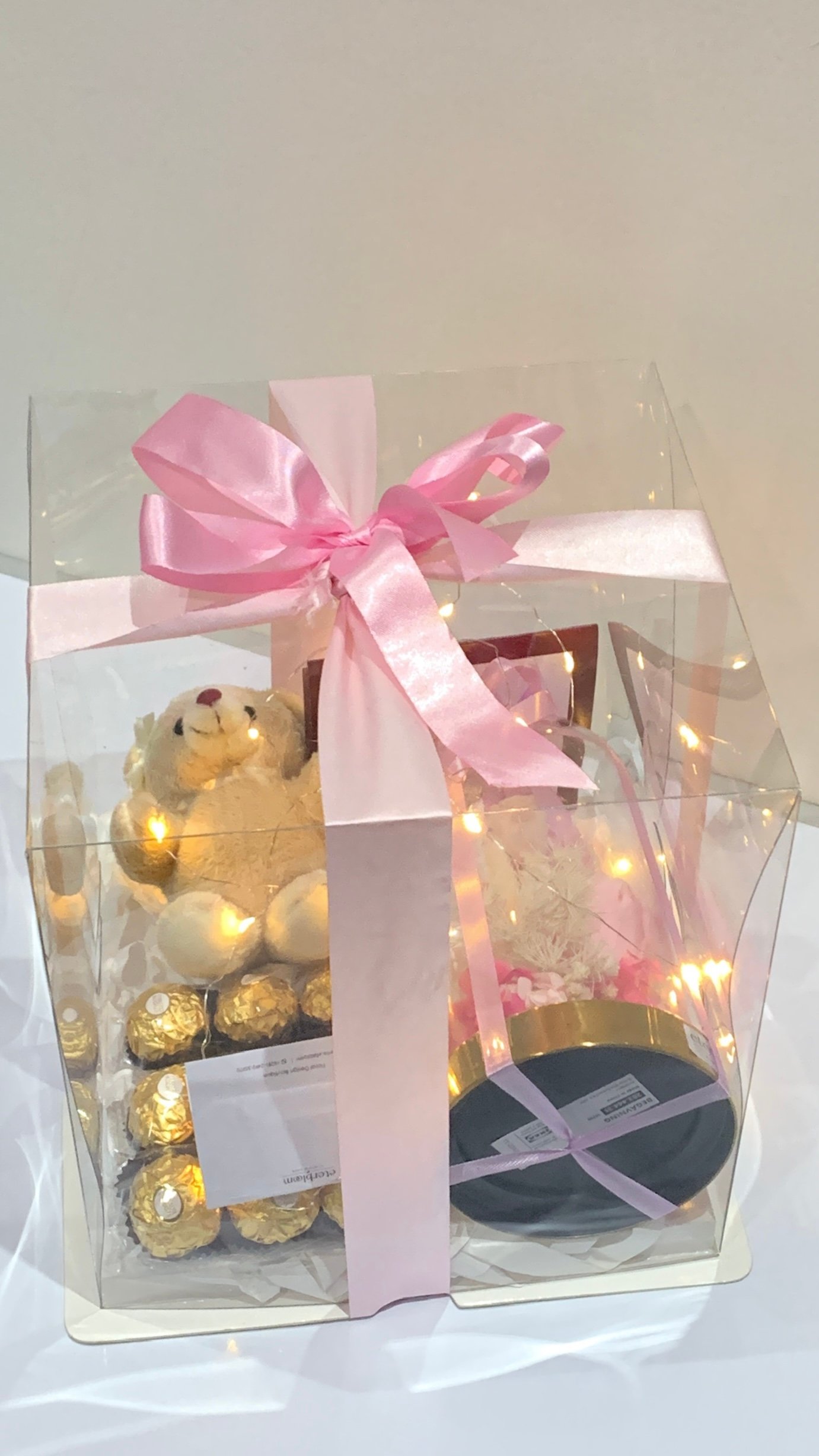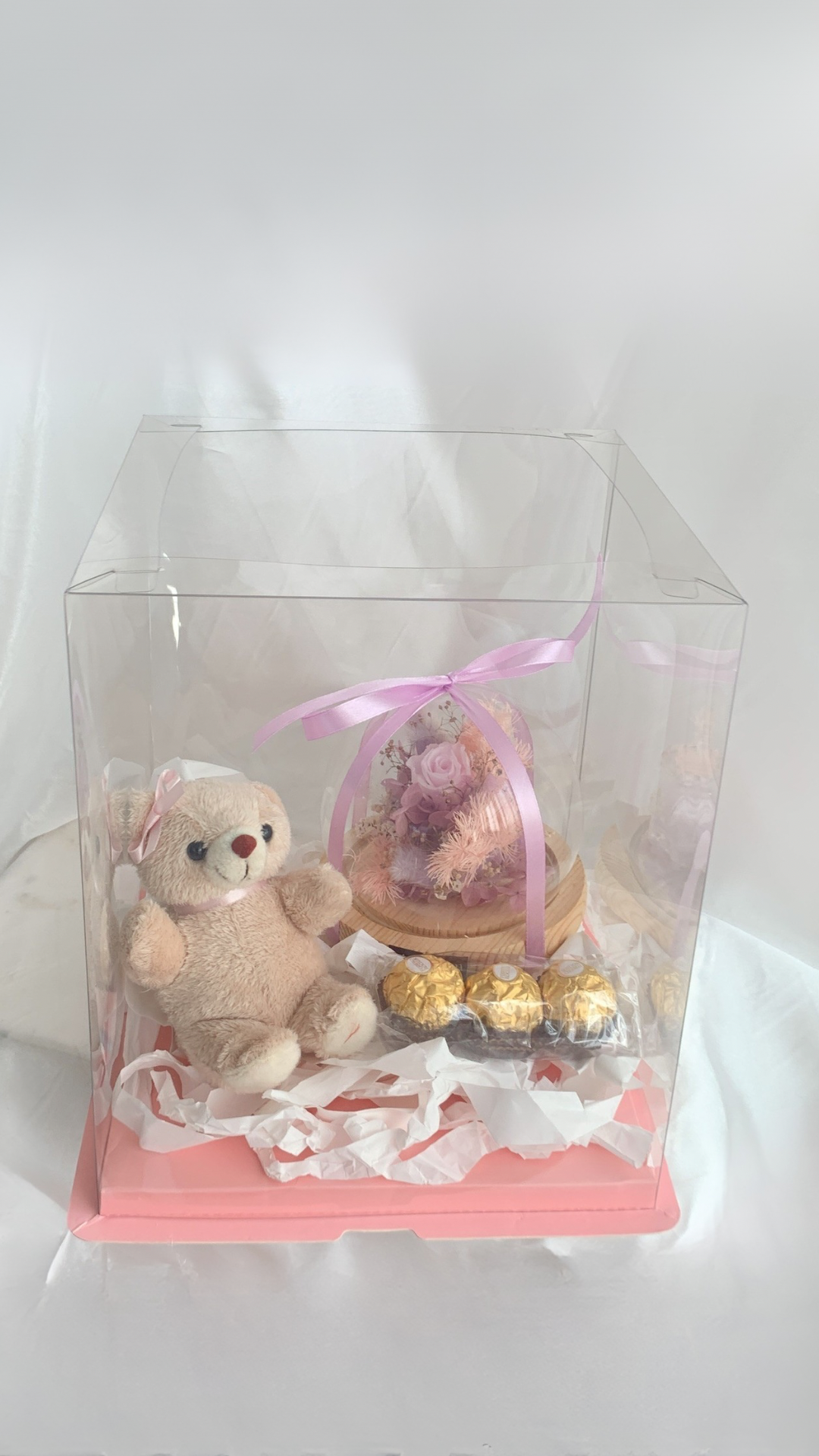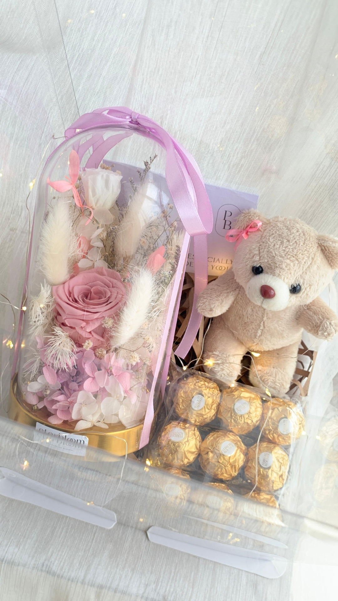 Now available in our Signature Gift Box: the Preserved Flower Dome Set — a stunning floral dome size of 10x20cm paired with 9pcs Ferrero Rocher chocolates, an adorable mini bear, and decorated with fairylights ,all beautifully wrapped in a premium keepsake box. A heartfelt, ready-to-give surprise perfect for birthdays, anniversaries, or just to say “you’re special.”